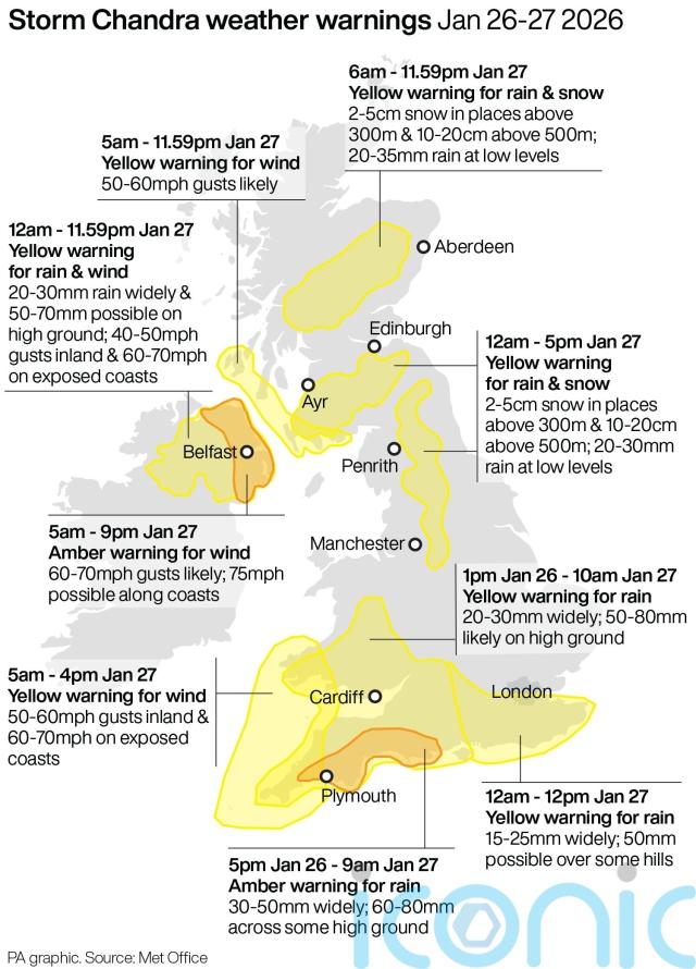 The UK Met Office said Chandra will bring “very strong winds” to Northern Ireland as it advised the public to expect longer journey times and likely cancellations on road, rail, air and ferry services.