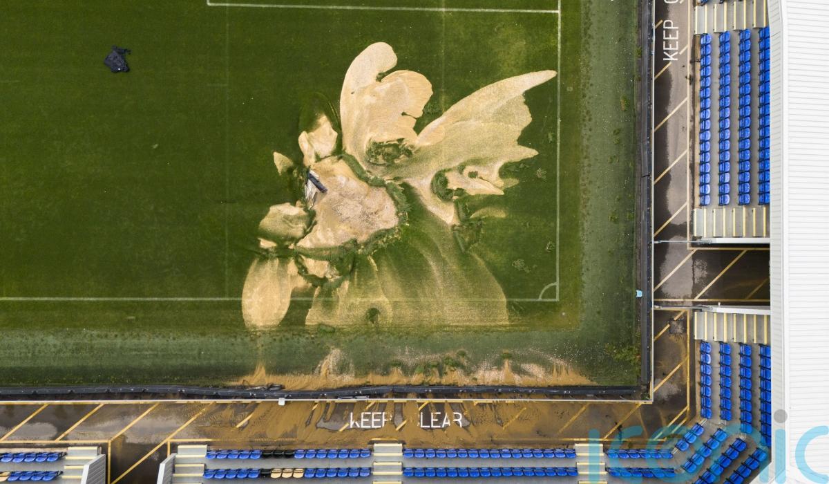 Images show one particularly damaged corner of the pitch with a misshapen surface following heavy rainfall in the area.