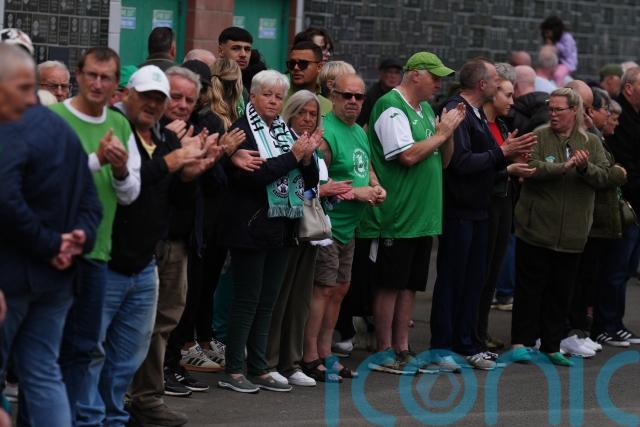 A crowd of at least 200 stopped as it passed, throwing flowers, Hibs merchandise, and other tokens of respect for the late businessman in front of the vehicle.