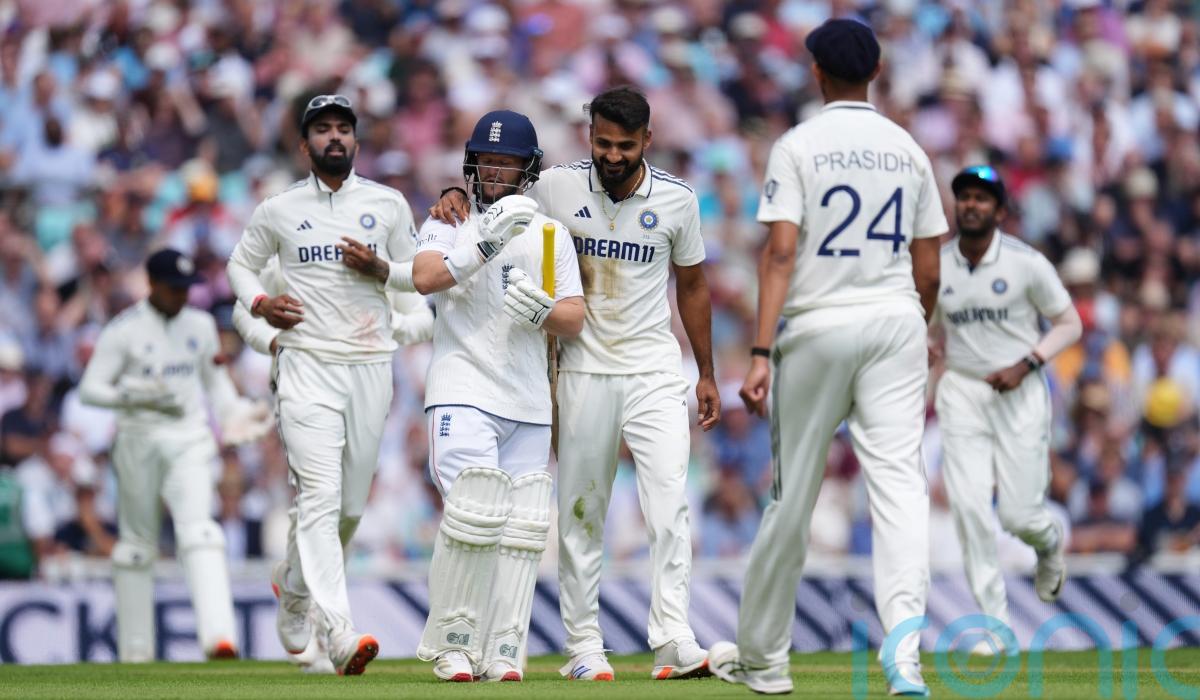 Bethell hit one glorious four through cover point but was pinned off the next ball, cutting short his first Test innings of the year. Krishna returned to remove Jamie Smith and Jamie Overton before the interval but Harry Brook rode his luck to remain in place on 33 not out despite some wild flourishes.